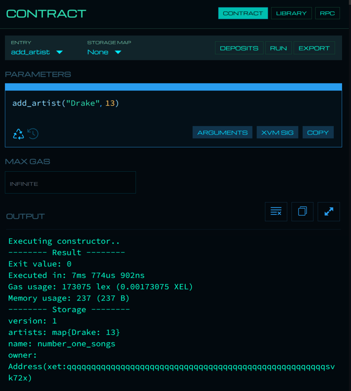 }[YOUR_CONTRACT_HASH]— the hash returned when you deployed in Part 3.[ENTRY_ID]— found in the ABI tab of the Export panel. Foradd_artist, the entry_id is1.[artist_name]and[num_one_songs]— the function arguments.