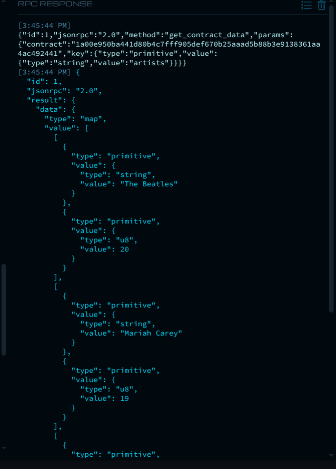 }Fill in your contract hash and send. You should see the artists map returned in the response.